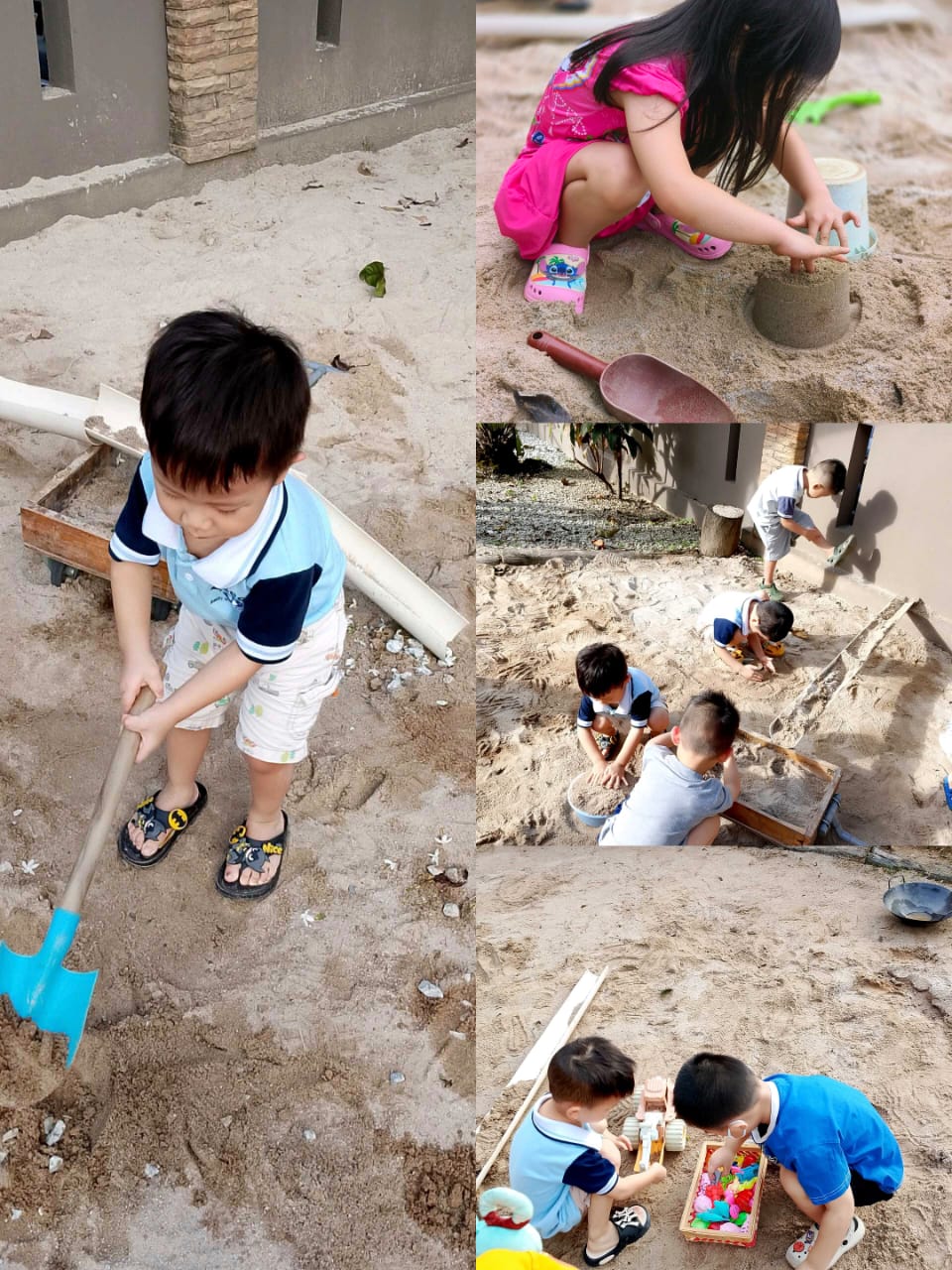 Outdoor kitchens with utensils with a sandpit nearby can generate countless variations of role playing and imaginative play. Physical movements of climbing, jumping, rolling and crawling can be facilitated deliberately through the choice of larger wooden equipment. Kids are encouraged to explore and play with nature materials found in the environment, which can stimulate their creativity and promote a sense of wonder and appreciation for the natural world
